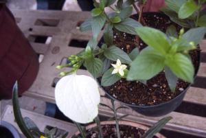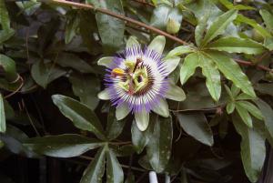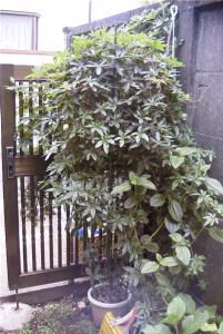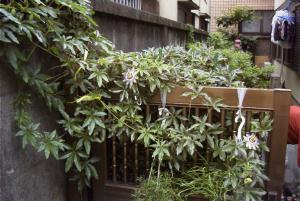 白い鉢からぼうぼうに生えている時計草。小さかったのにあっという間にこんなに育ってしまいました。 |