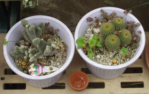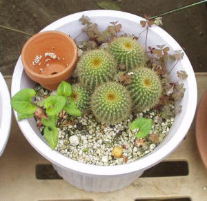 ぼいんずと、さぼちんは、こんな感じ。真ん中に置いてある小さい鉢が、もともとぼいんずと、さぼちんが入っていた鉢。 |