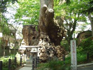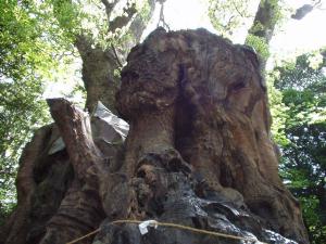 これが、天然記念物に指定されている大楠。樹齢2000年。ものすごい威厳・尊厳みたいなものを感じる。人間なんてちっぽけだーって思わされる。 私は霊感はないが、木から霊気みたいなものも感じた。ただただすごすぎる、という感想。あまりのすごさに、ここにずっといたら、頭痛がしてきた。 |