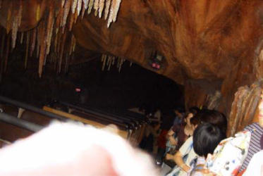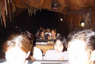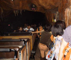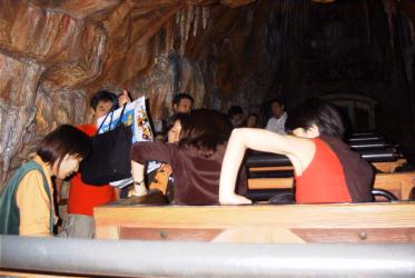 | ってことで、再度、乗車。時間が遅かったので、20分待ちくらいにまで空いていたにも関わらず、「当日に限る」って書いてあるから、使わなきゃ損よねってことで、優先入場券を使用。 この優先券を使用するには、出口から入る。出口は当然、乗り終わった他のお客さんが出てくる。それにモロに逆流して、進んでいく。「何、この人達?」という目で見る人もいる。うぅぅ、いくら優先券っていっても、なんだか肩身が狭いぞ。でも、めげずに進んでいったら、乗り場近くまでついた。係の人にその券を見せたら、「はい」と慣れた態度で、乗り場に通してくれた。しかも、ちゃあんと、出口から乗り場までの通路(通り道というか、ややショートカットのもの)もあるのね‥‥。知らなかった。よって、入り口から普通に並んだ人の邪魔にはならずに、乗ることができたのでした。ん〜、複雑‥‥。 |