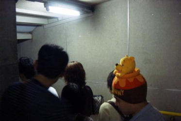 階段にて下まで降りる。下まで降りたら、レールの上を渡って(またいで?)、むこう岸へ渡る。今さらながら、「レールってこんな幅なのね」など、いらないことに感心してしまう。でも、係の人の誘導も慣れたもので、そんなにしょっちゅうあるのか!?っていう感じ。 |