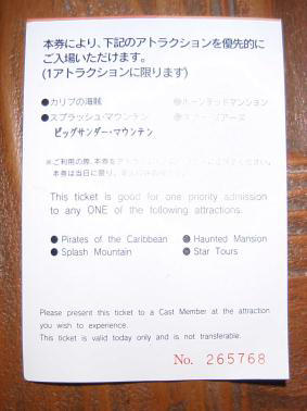乗れなくて、ごめんなさい、のお詫びということで、←のような優先入場券をもらった。 本券により、下記のアトラクションを優先的にご入場いただけます。 (1アトラクションに限ります) ●カリブの海賊 ●ホーンテッドマンション ●スプラッシュマウンテン ●スターツアーズ ●ビッグサンダーマウンテン というのもの。265768のNo.が泣かせる。そんなにたくさん発行してるのかぁぁぁ。 カリブの海賊はそんなに混んでなさそう、ホーンテッドマンションは乗っちゃったし、スターツアーズは点検のため休みだったし、ビッグサンダーマウンテンはたった今、中止になちゃったでしょ〜ってんで、残ってるのはスプラッシュマウンテン。1度乗ったけど、ま、いっか。 |