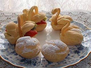 フランス語でシュー・ア・ラ・クレーム。 シューがキャベツを意味することは もう有名な話ですよね。 ホイップクリームを詰めたスワン カスタードクリームにフルーツをあしらったバスケット。 3種類のシュークリームはいかが? |